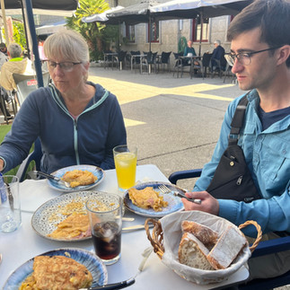 Summary of the Day: Today we left the little cottage we were staying in right off the Camino near the monastery in A Armenteira and headed out in the the early morning darkness toward Vilanova de Arousa. It was down right chilly there in the shadow of the mountain. We walked towards the valley and down into the forest nearly in the dark. The forest path we followed was filled with beautiful moments as the sun began to come up. We walked continually beside a clear stream with water falls and pools as clear as crystal and deep enough to swim in. As the sun rose above the mountain we left the forest and got into the outskirts of the small towns. Even then we walked for a long time beside a beautiful river. The temperature was perfect and the combination of wind and sun made walking feel wonderful. There were quite a few bikers on the trail through the town and that can be a challenge because they are moving fast and most of the time it is hard to hear them. Around one (the earliest time you can get lunch here) we stopped at a cafe and shared a very large Spanish omelet for lunch. We needed a lift at that point after doing close to seven miles. As we walked further south we encountered enormous vineyards covering many acres. The grape vines grow up and are suspended on a trellis that allows the grapes to be harvested from underneath. As we continued to walk south the horizon fell away and you could begin to see the ocean in the distance. The final leg of our trek walking beside the water into Vilanova de Arousa was some of the most beautiful coastline I have seen since back in Portugal. It was just stunningly beautiful. We will be spending the night here and tomorrow we will catch a boat headed up to Padron. From there Santiago is just a few days off.
